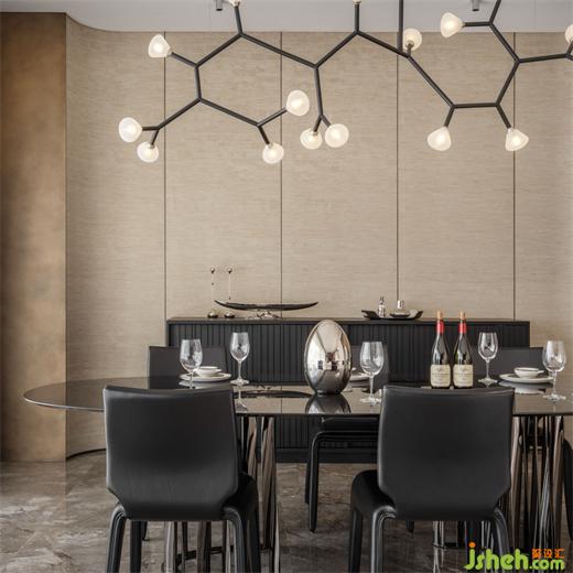 就像這餐廳的黑色餐桌,引用有序的建筑結構,基座的纖細金屬條扭曲直立,私人別墅裝修設計鋁腿的曲折感賦予其雕塑般的外觀。配以同色的ROCHE BOBOIS餐椅、褶皺感邊柜與枝形吊燈,黑色之上,勾勒出家人共處的踏實穩(wěn)妥。