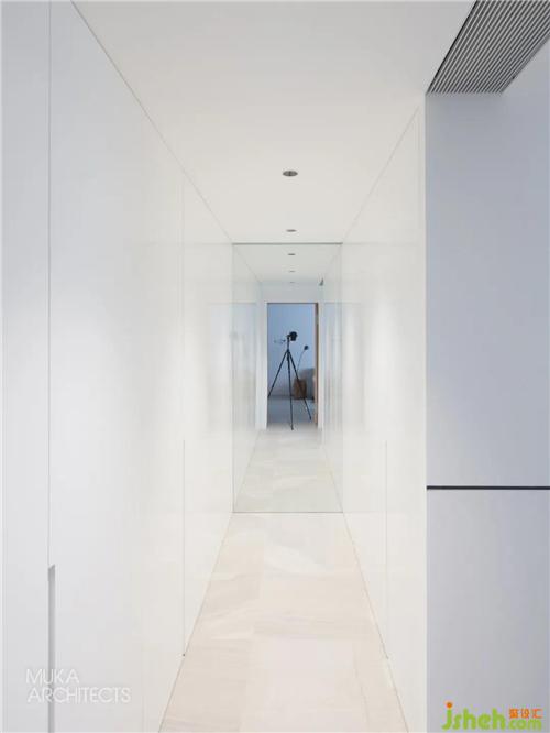 高處的鏡面起到很強(qiáng)的視覺延伸效果,模糊并重塑了空間的界限,鏡面代表了水,亦蘊(yùn)含著他們?nèi)胧郎钪械纳仙迫羲?