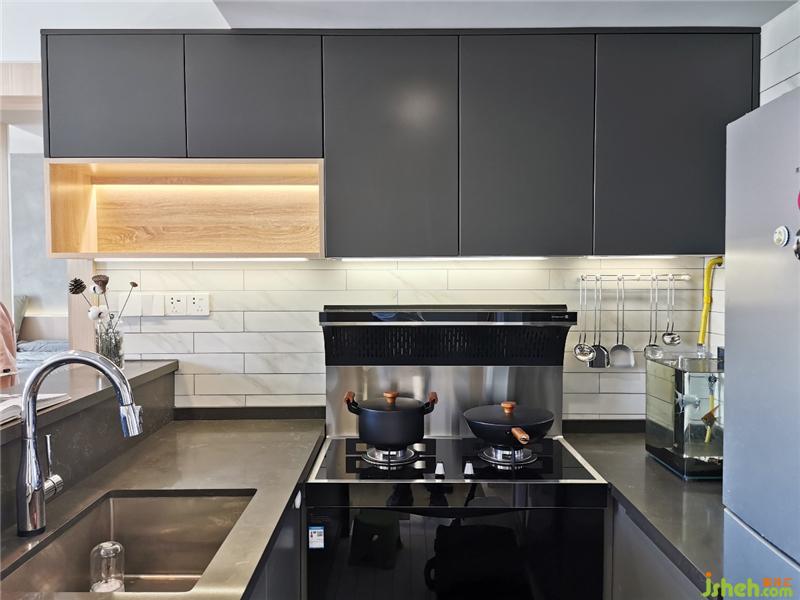▲集成灶可以提高排油煙的效率;櫥柜吊柜手掃感應(yīng)燈,方便開關(guān),同時提升臺面照度。室內(nèi)設(shè)計師