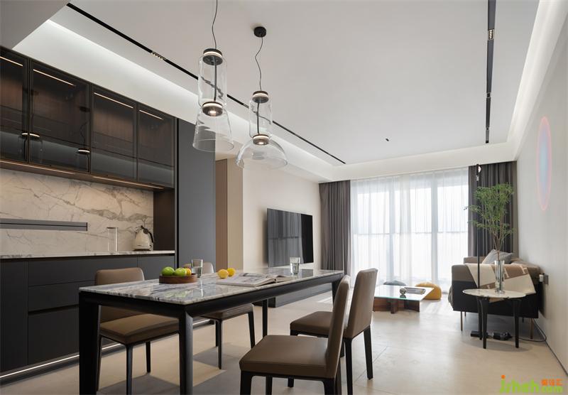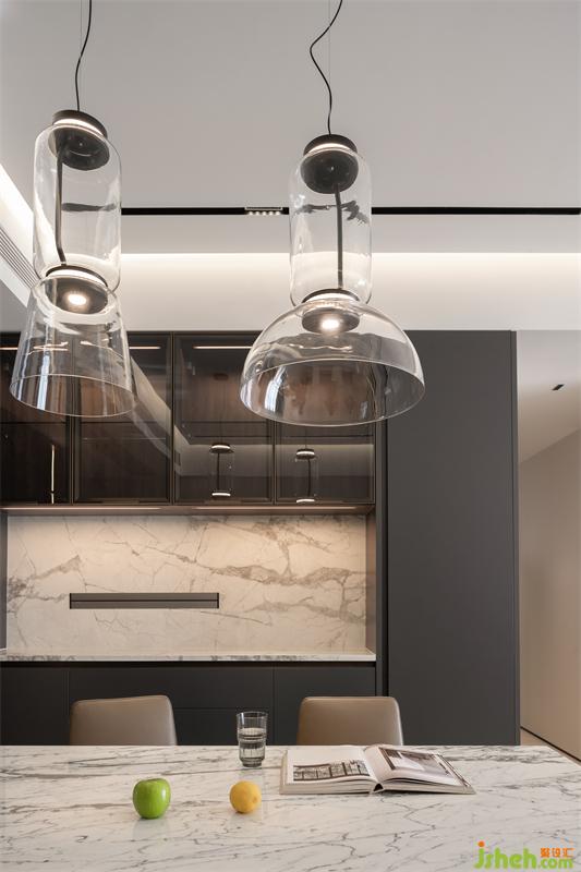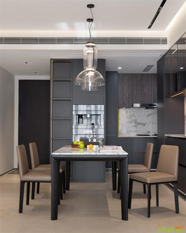 邂逅眾多的高品質(zhì)電器,深色的櫥柜和淺色的巖板形成對比,強烈的視覺沖擊力,讓簡約的廚餐空間多了一份優(yōu)雅。