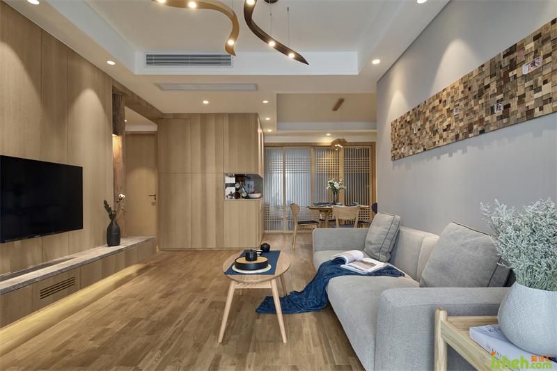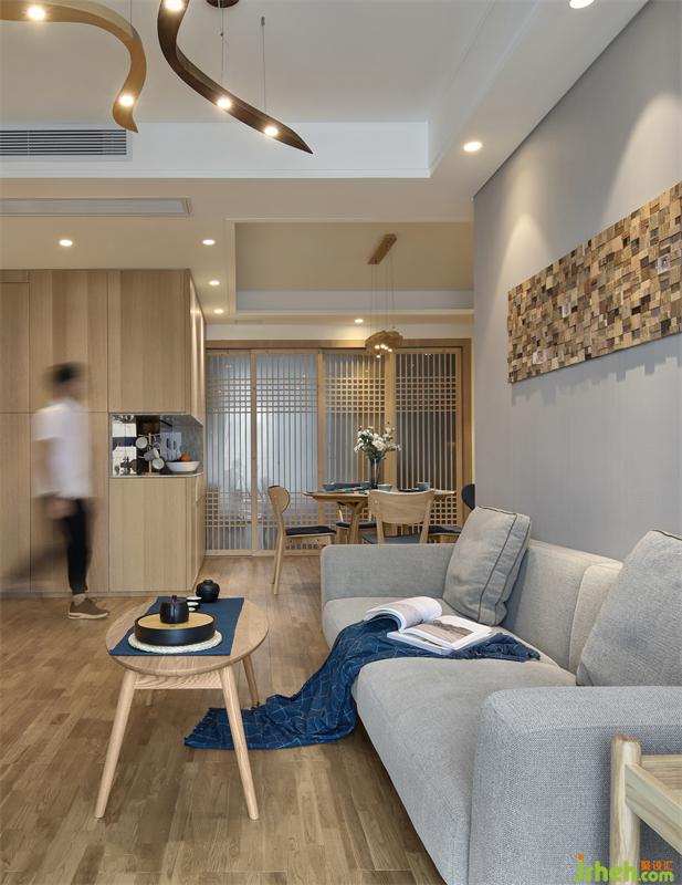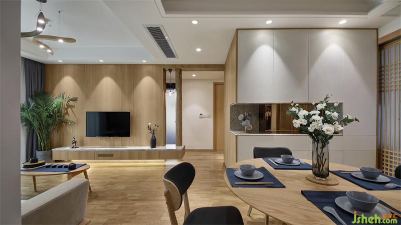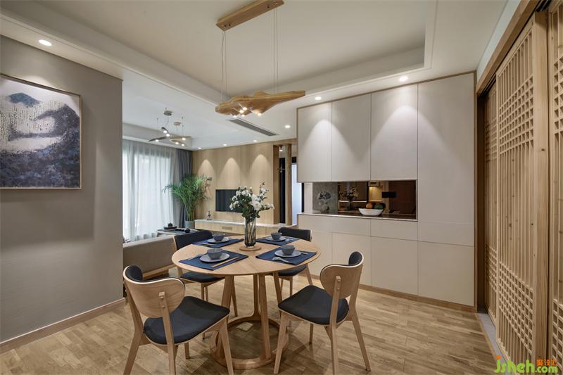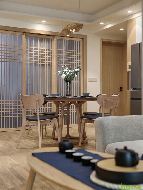 餐廳區(qū)域和客廳是兩個(gè)方形空間錯(cuò)位連接,柜體的設(shè)計(jì)靠墻是最節(jié)約空間的方式之一,正好可以利用此格局,依墻設(shè)計(jì)L型餐邊高柜、收納柜、冰箱、烤箱的位置??筒蛷d收納的問題解決了,但是由于收納柜多了很多,餐廳的空間通透性卻減少了。如何擴(kuò)大餐廳的通透性、同時(shí)讓整個(gè)空間所需要的日式風(fēng)格能夠很巧妙的呈現(xiàn)出來?
