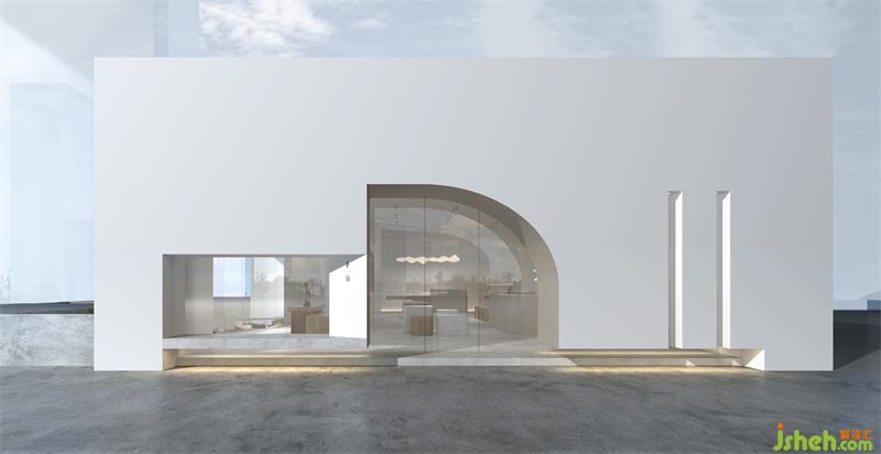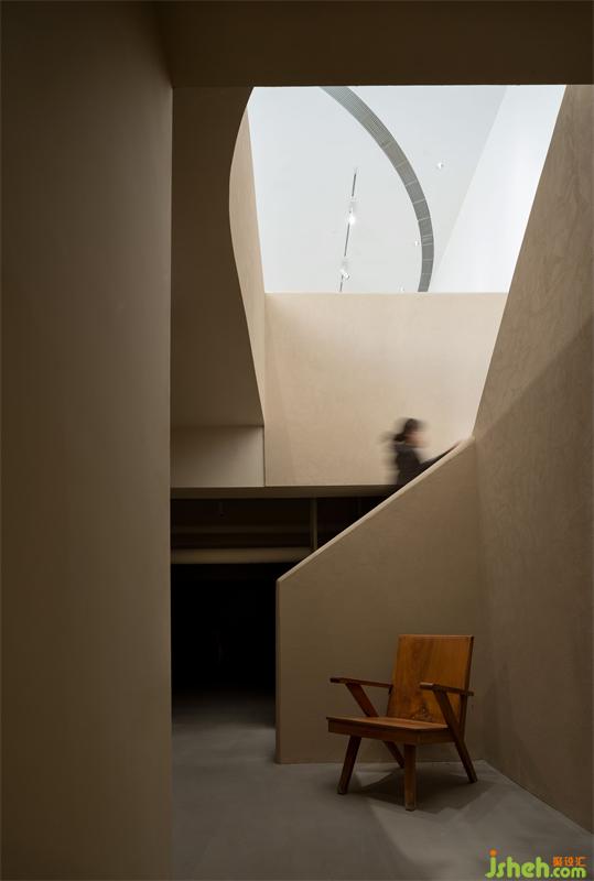 “容”可以解讀為容器,器物感空間形態(tài);也可作包容,不同的作品,傳達不同的生活解讀和藝術價值觀。室內通過“容”的概念語匯來傳達出區(qū)別于傳統的藝術空間。設計師希望通過純粹的幾何形式,表現出現代建筑語言及流動性的概念,打破傳統空間規(guī)則,以及墨守成規(guī)的模式性。人自由的游走于其中,不同的視角和曲面維度。利用白色的墻面作為底色,產品可以非常自由的組合呈現,構成不同的畫面感??臻g的塑造過程中,剔除多余的元素。盡可能的回歸到本質,讓展品和流動的人成為主體核心。