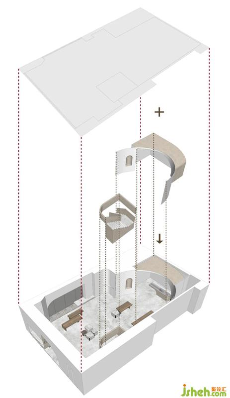 運用幾何的韻律美感,透明,穿透的構成形式,塑造自由流動的空間形態(tài)。半弧形的曲線,塑造出一個柔軟旋渦的空間,利用虛擬的界限,空間與空間形成流線型的體驗,同時界定不同功能屬性。在聲學上,半弧形區(qū)域還能對聲音起到收斂效果,增加其私密性。透過大廳玻璃,庭院景觀可以無障礙的進入室內,讓室內外形成對話,豐富了色彩和畫面。展陳方式主要是通過不同組合形式的展臺呈現,展臺的組成可以根據不同的展示需求作靈活的調整,墻面點綴的造型孔洞,構成了空間的立面構成關系,可作為重要藝術展示窗口。