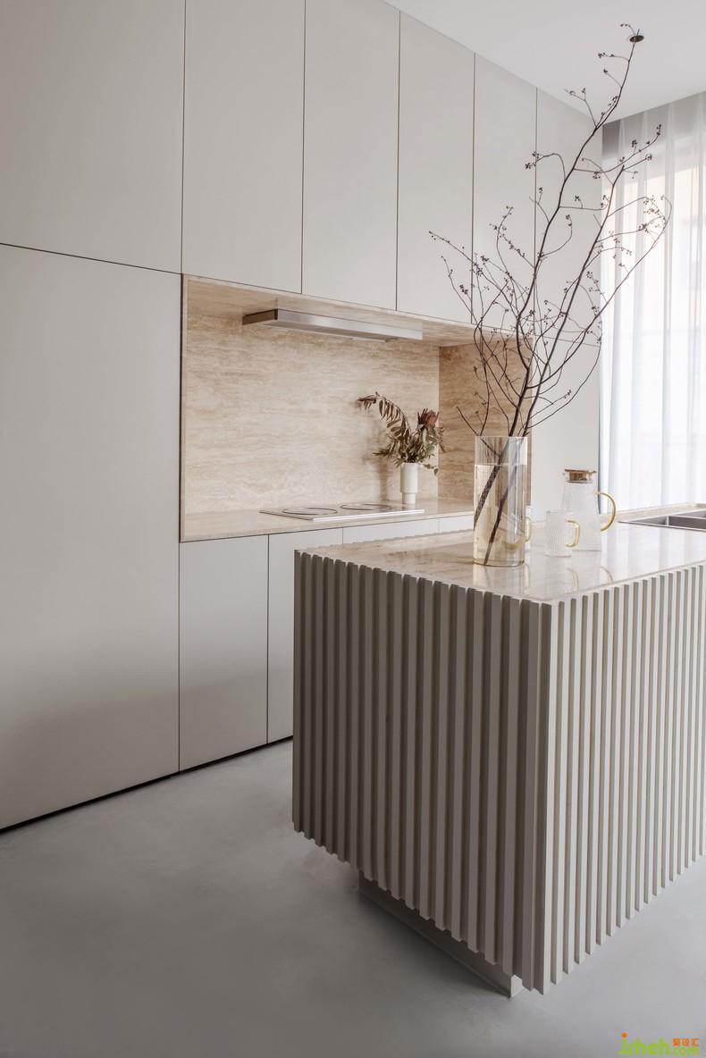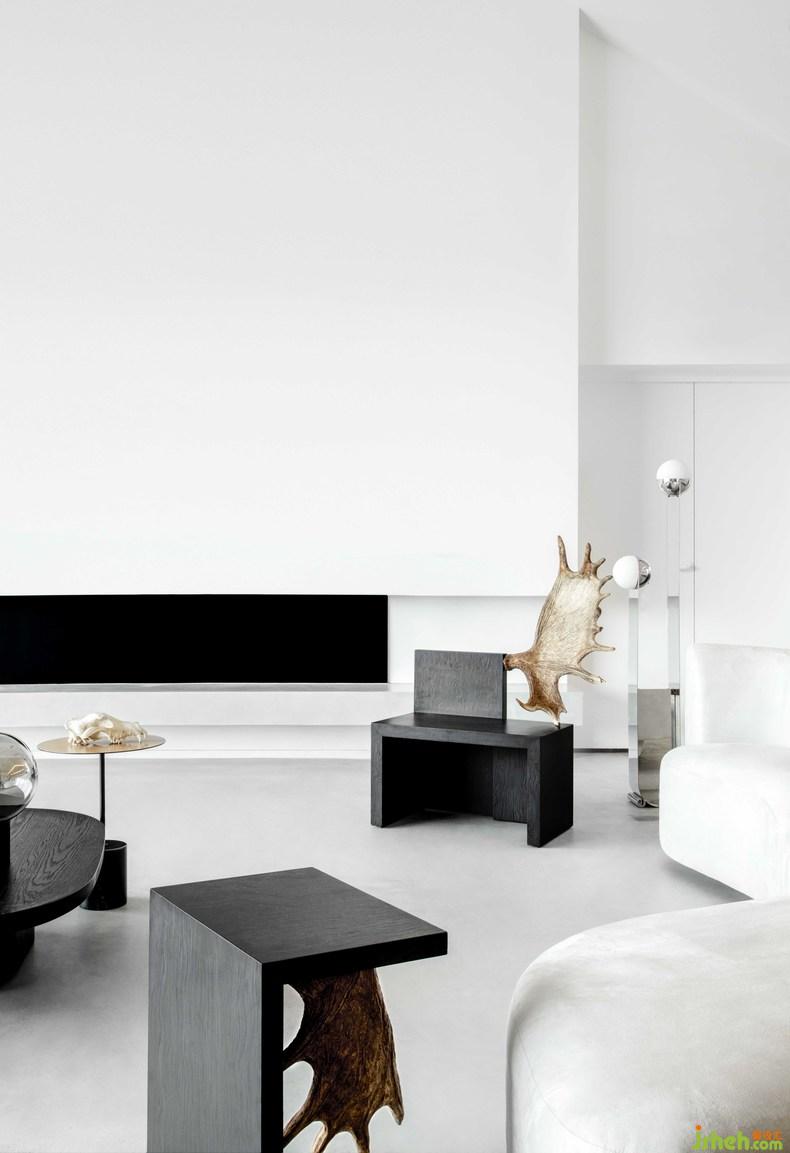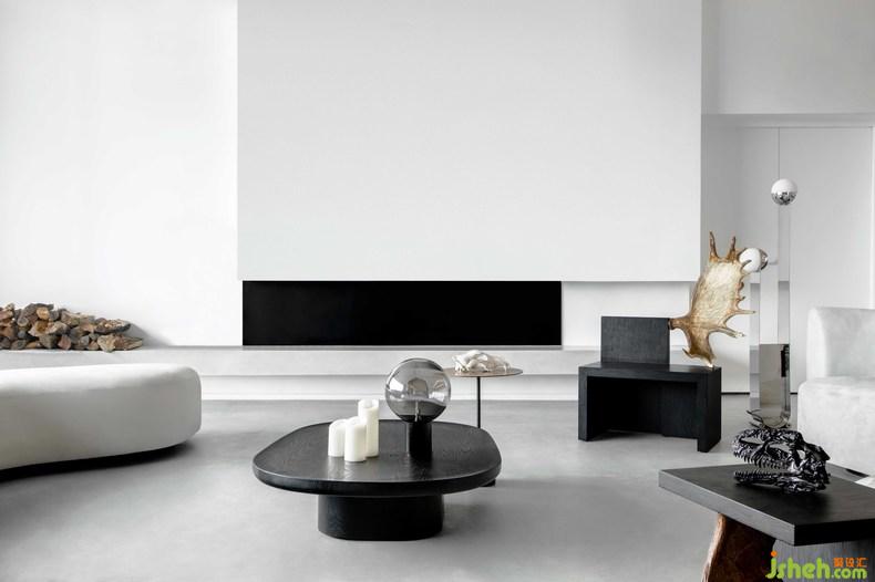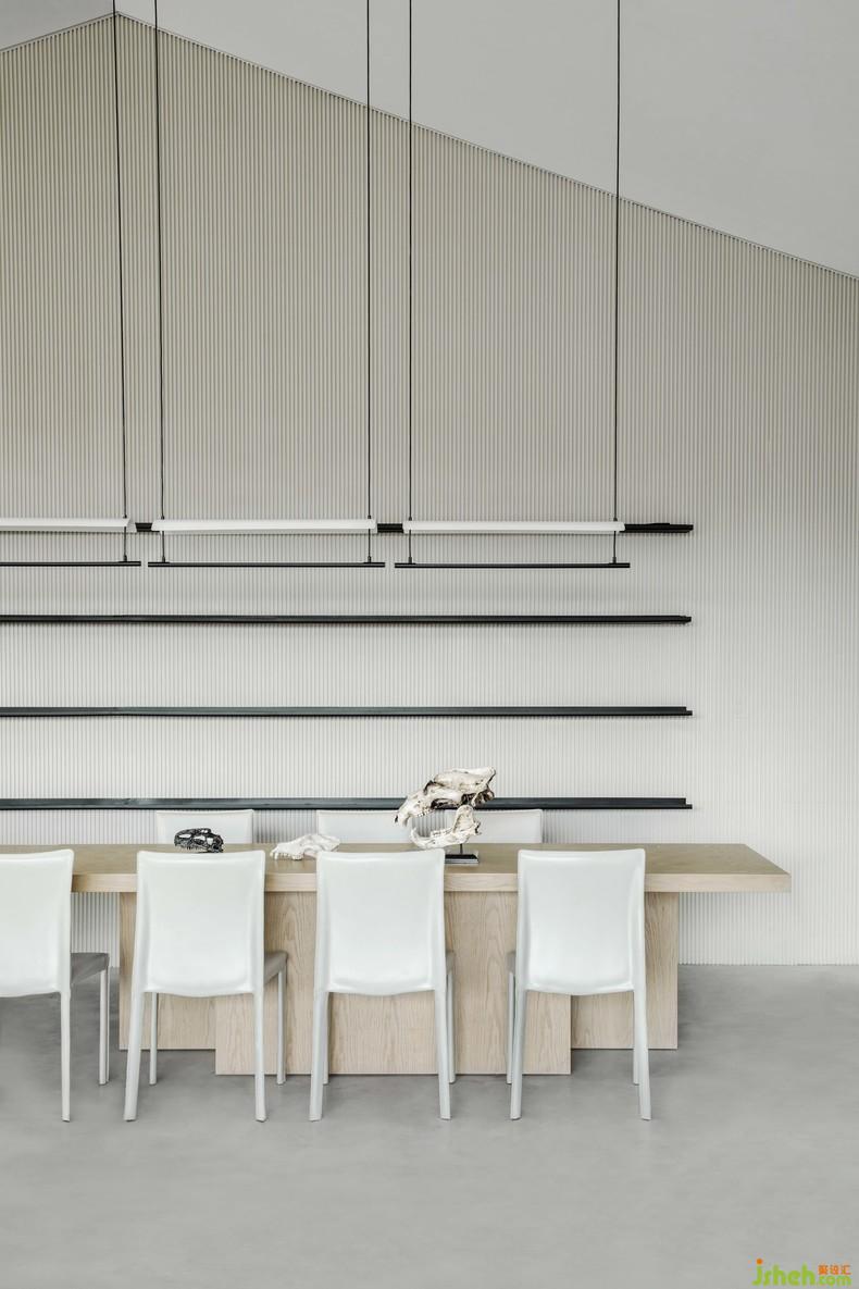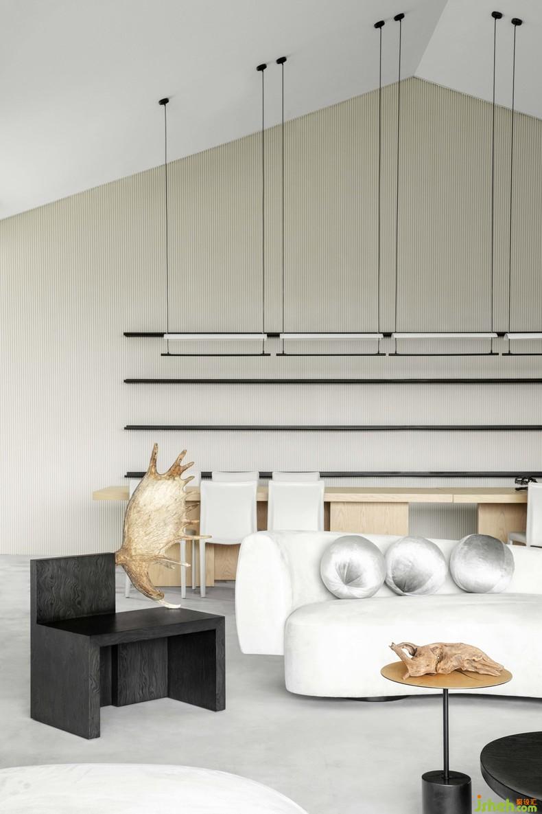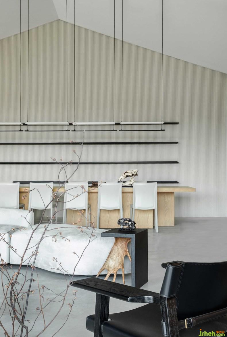 外層空間的壁爐墻被線條幾何分割,在這里,投影需求的滿足使得游戲,室內(nèi)設(shè)計(jì)師觀影,唱歌等集體活動(dòng)都能得到展開。一對(duì)曲線長沙發(fā)臨靠著兩面連續(xù)的落地窗戶,幾何線條與形狀的穿插以形造意,賦予空間極致的簡約與愉悅的體驗(yàn)。側(cè)面的長條桌可兼用作群體聚餐或團(tuán)隊(duì)會(huì)議,桌子一邊配備有獨(dú)立島臺(tái)的廚房。