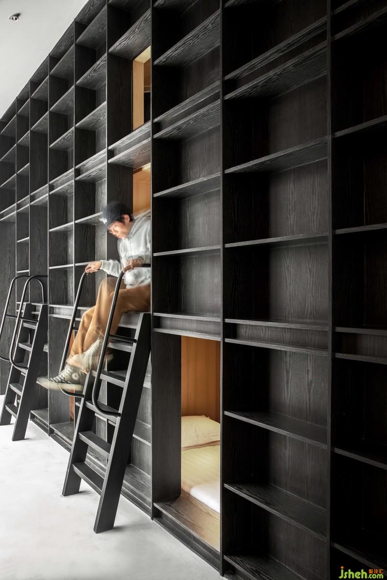 內(nèi)層空間的一側(cè)“外立面”是外側(cè)空間的長廊“書架”;而在“書架”的另一面,低層膠囊睡眠艙又被劃分為雙層,被壓縮至極致的睡眠空間就是床本身。在小小的內(nèi)層空間中,居住的空間概念被質(zhì)疑、顛覆和重組。