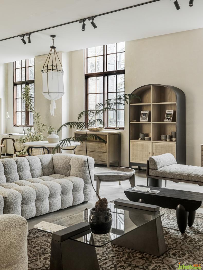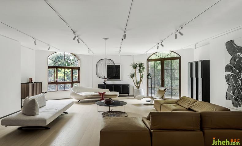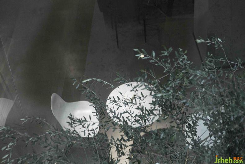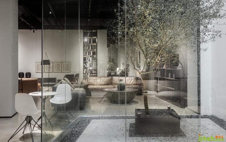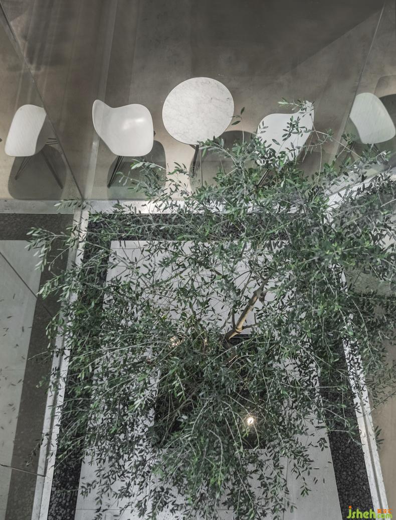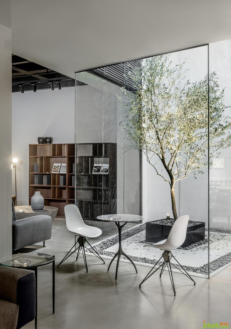 中庭區(qū)域,將天光引入,空間與材質(zhì)配合借景,用綠植創(chuàng)造出一個(gè)半環(huán)繞式的空間,引導(dǎo)流線向更深處前進(jìn)。同時(shí)增加中央?yún)^(qū)域的通透性,緩解人游走過(guò)程中的疲憊感。