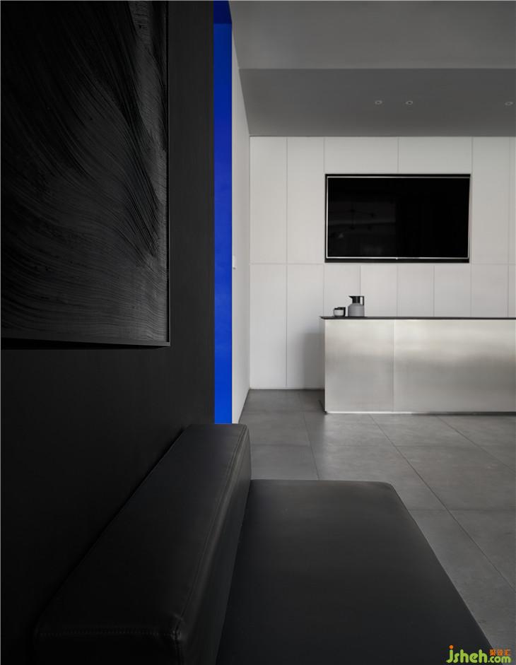 設(shè)計(jì)師在洗、剪區(qū)域之間的墻體下方預(yù)留了五個(gè)洞孔,室外的光線能夠不動(dòng)聲色地進(jìn)入洗發(fā)區(qū),后經(jīng)克萊因藍(lán)的過濾,輕薄光線在黑暗中交疊、滲透,引導(dǎo)客人行徑之余竟有一種欲說還休的美。