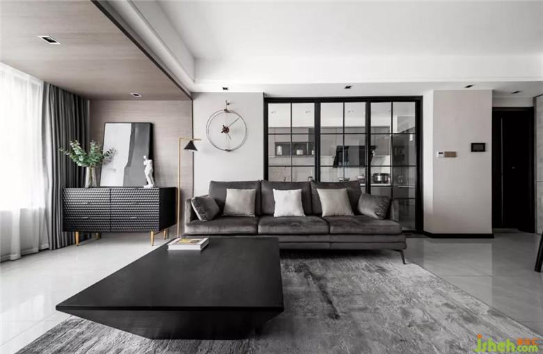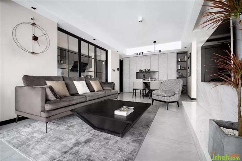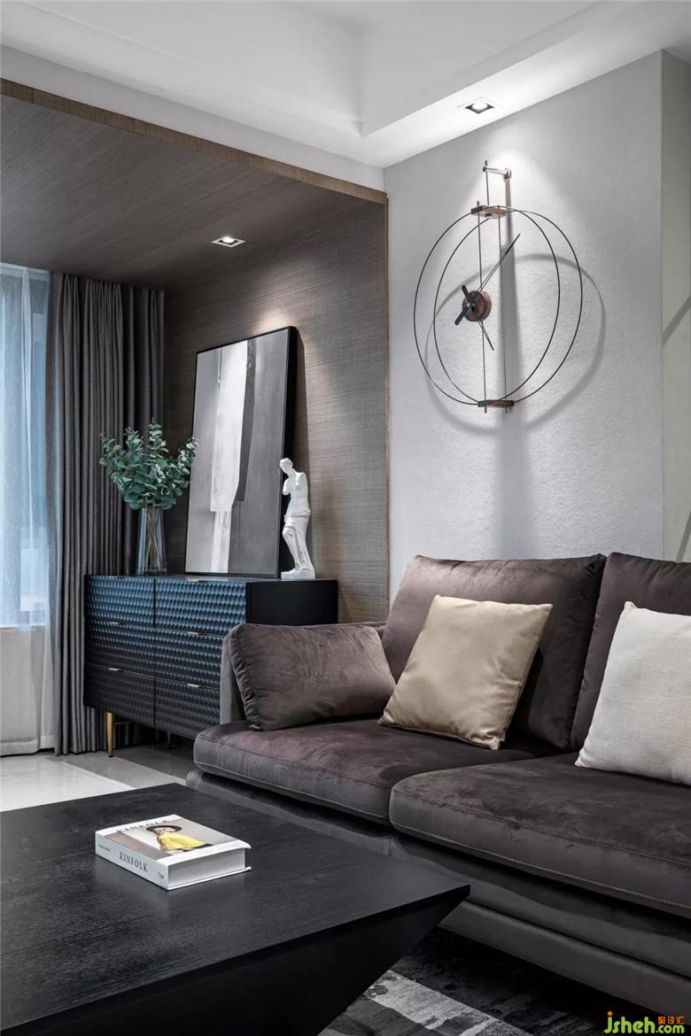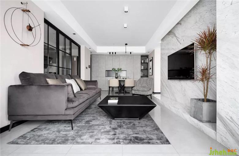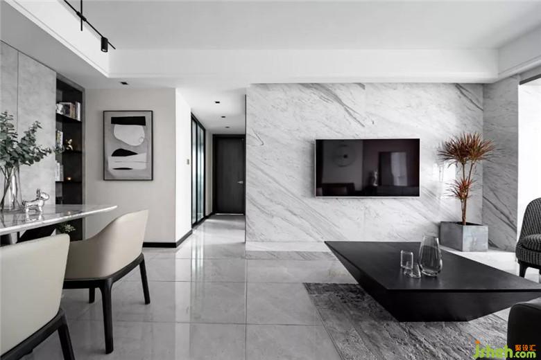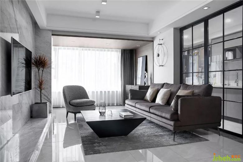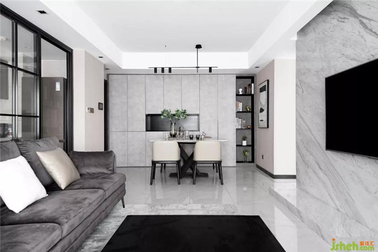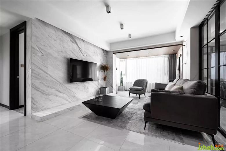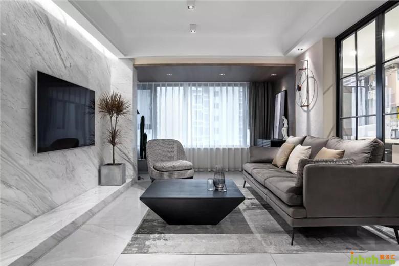 大面積灰色墻布作為空間的底色,裝修公司局部采用了爵士白天然大理石,休息陽臺(tái)采用了木質(zhì)飾面板,沖破黑白灰?guī)淼某翋灨小?