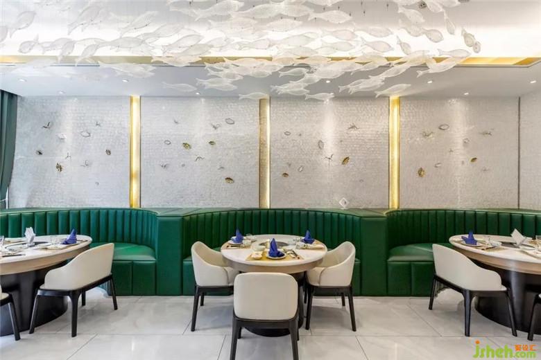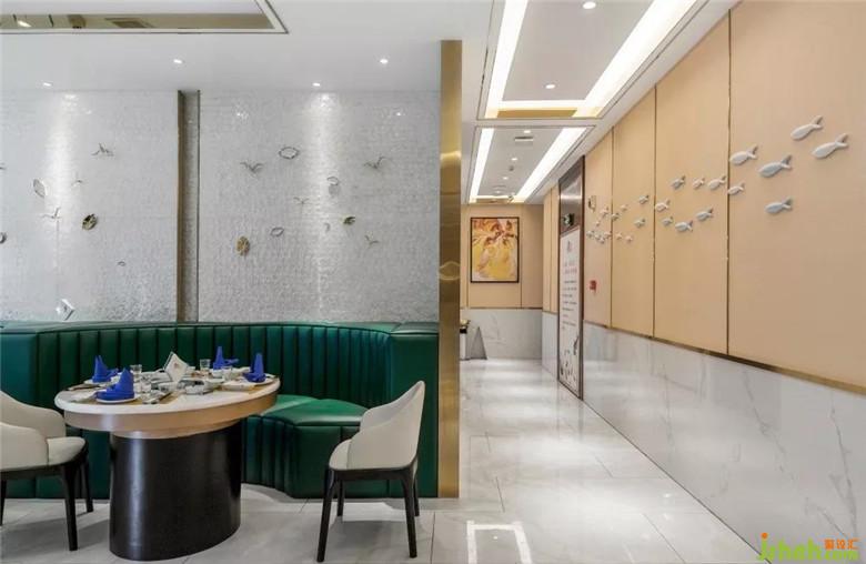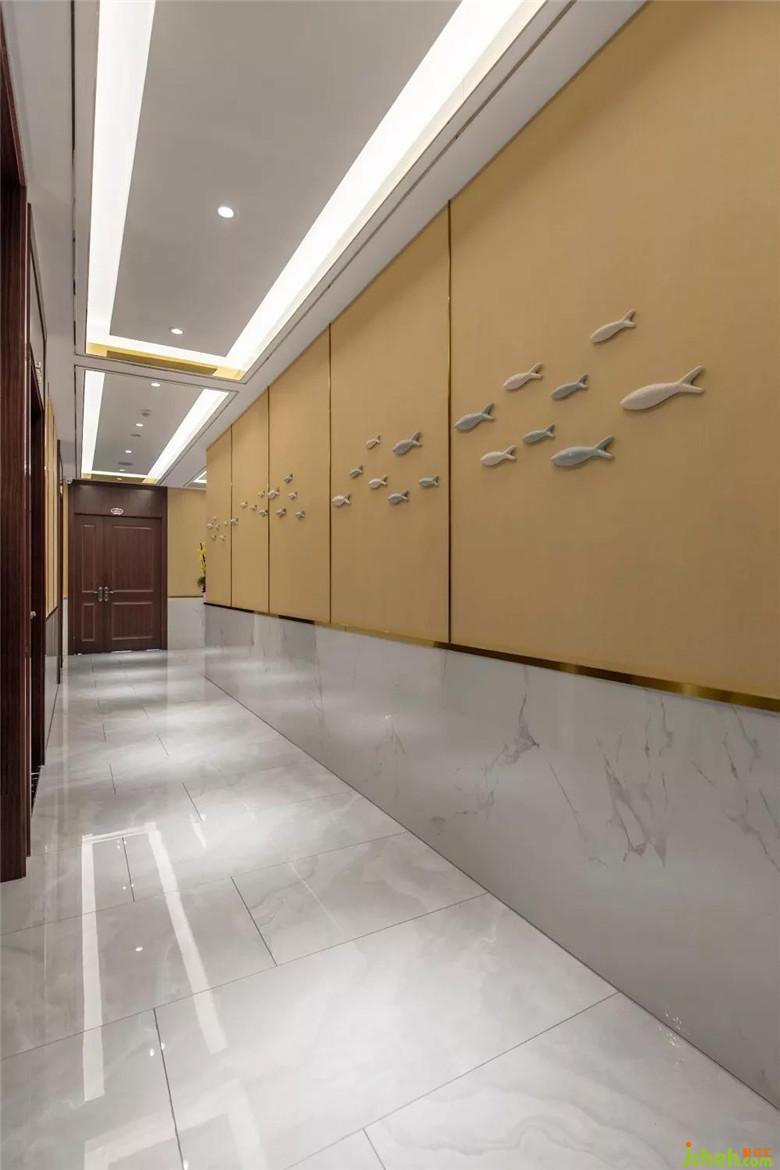 整個空間都貫穿著“魚”的元素,為此特意從廣東定制了“魚型”水晶吊燈,組成一個大的“魚型”做在大廳,在大廳墻面也專門從廣東定制了3mm的貝殼板,讓整個大廳顯得更有海洋的氣息。