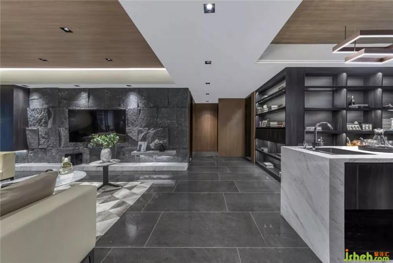沙發(fā)背景墻900X1800的超大亮光磚,與粗山石的電視背景墻輝映,整體色調(diào)柔和。反射出的環(huán)境色微微透著光影,再附以大面積的木質(zhì)、天然材料,二者相容,猶如清潭水光映入地面。