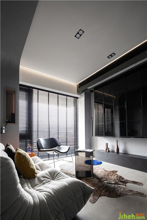 設計師利用黑白兩色打造一種極簡舒適的居住體驗。超大的陽光落地窗外,城市風光和清新綠地一覽無余。藍色和茶色在空間中點綴增加了個性。裝修設計適合小憩的角落,不需要過多裝飾來取悅自己,隨意反而舒適很多。