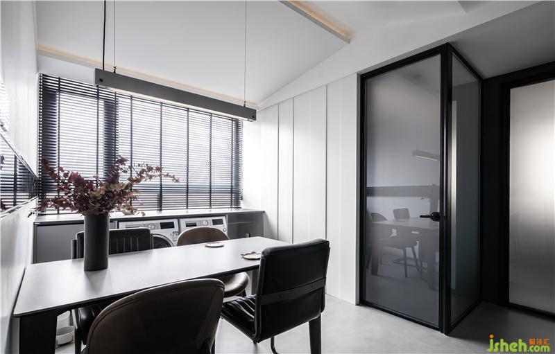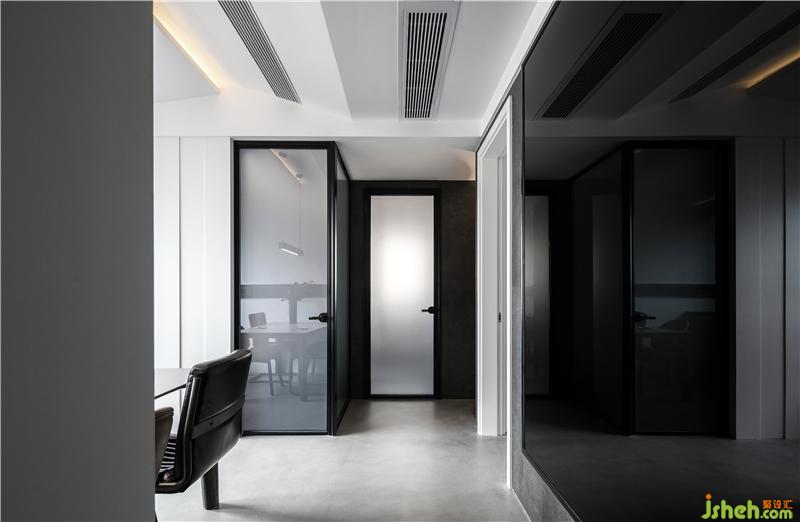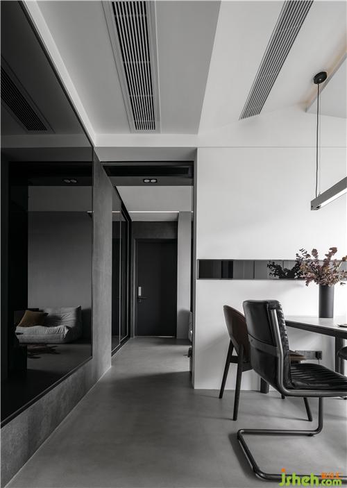 圖中走廊的右邊是黑色玻璃,盡頭是衛(wèi)生間,衛(wèi)生間的門是長虹玻璃門,長虹玻璃通透,透光不透視,可以制造明亮的視覺效果,特別是當光打在上面有一種朦朧的美感,配合極窄細邊框,可以讓空間顯得更大更簡約。衛(wèi)生間的左邊是次臥,次臥的墻體和門采用了玻璃門的樣式,使得其與衛(wèi)生間渾然一體,空間的整體色調(diào)一致。
