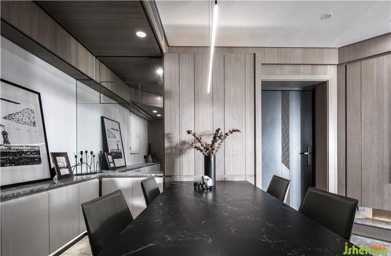 白色紋路的黑色巖板餐桌讓空間提升了一份質(zhì)感,搭配黑色的餐椅、木飾面的背景,以及白色的矮柜,不同的色調(diào),讓空間整體顯得十分協(xié)調(diào),讓餐廳小空間也變得大了起來(lái)。