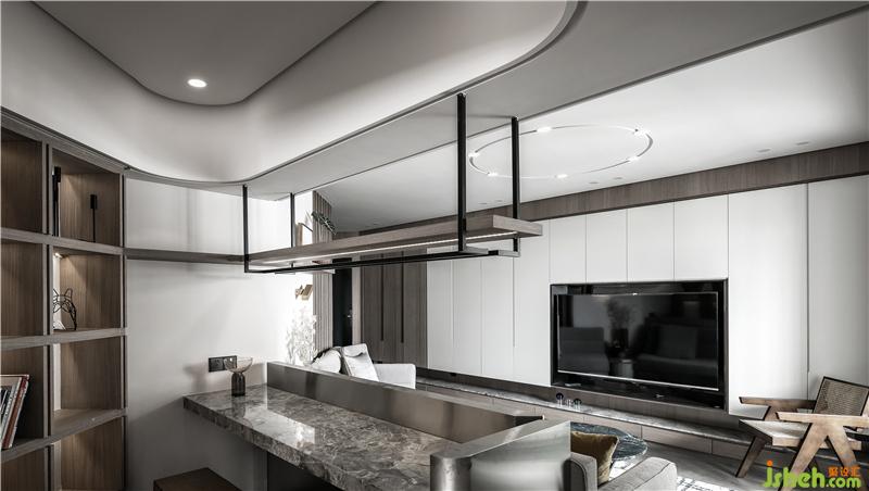 吧臺區(qū)用了大部分的金屬面,臺面部分為大理石,搭配一張木色的長凳。格外有意境。吧臺的主要燈光為上方的吊燈,木色的燈具,用黑色鐵藝固定,中間挖槽暗藏?zé)魩А?nbsp;