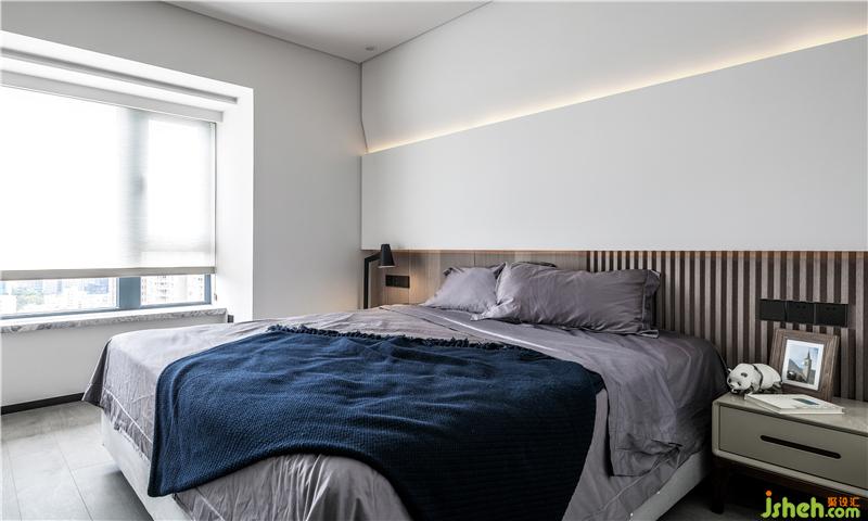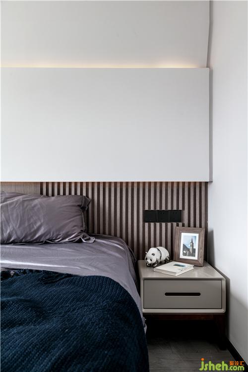 主臥背景墻采用木飾面+木格柵形式,以淺色調(diào)塑造自然、質(zhì)樸的氣息。上方為白色烤漆面的柜體作為硬包背景。上方暗藏?zé)魩А?