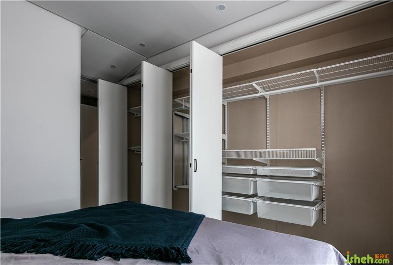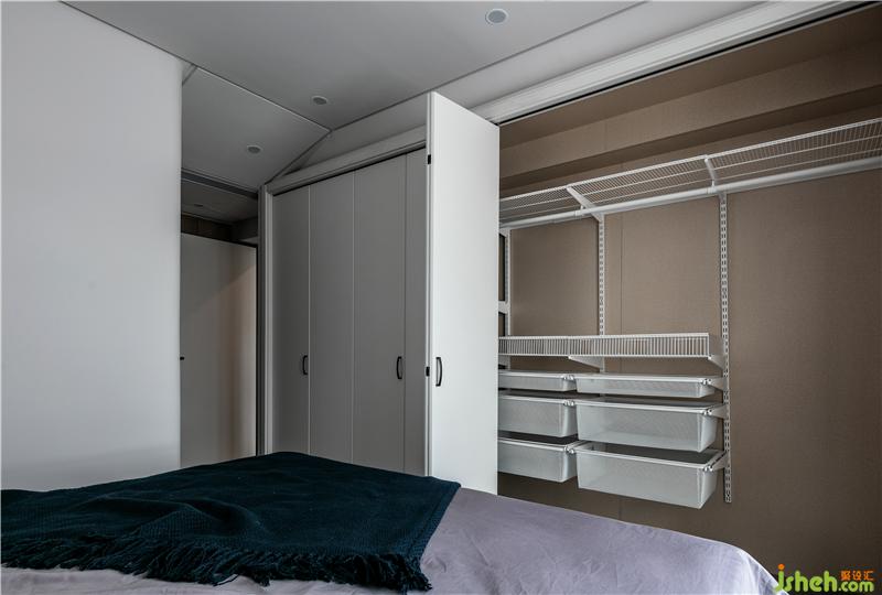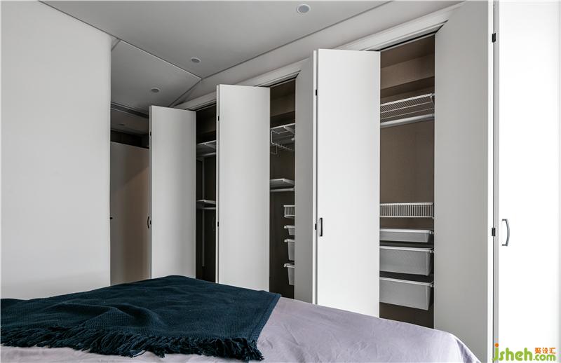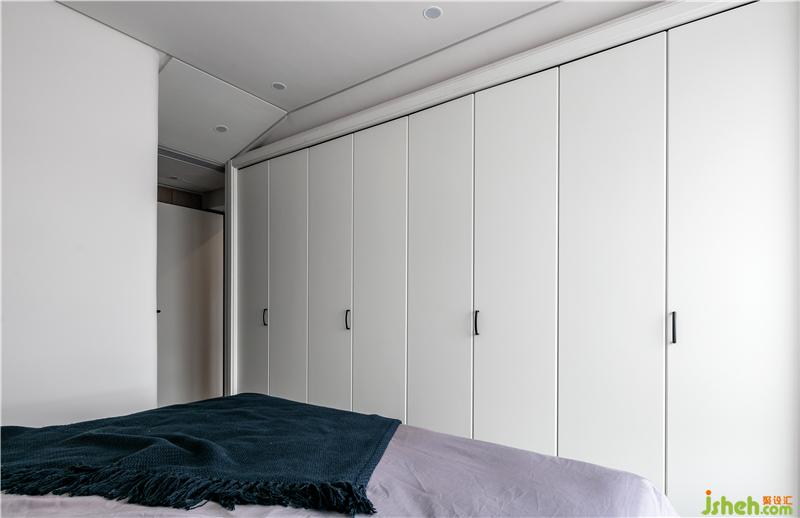 臥室的一整面的頂天立地的衣柜,白色烤漆柜門搭配黑色的柜門拉手,柜門為折疊門,里面是業(yè)主挑選的抽拉置物架。白色的衣柜可以讓空間顯得更加簡潔,也讓衣柜看起來不那么占用空間。