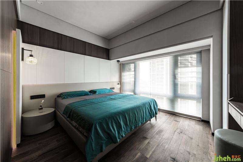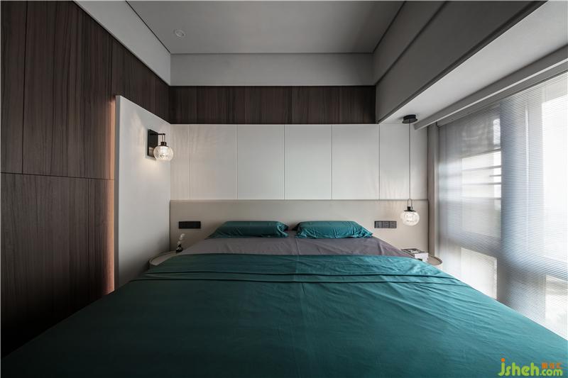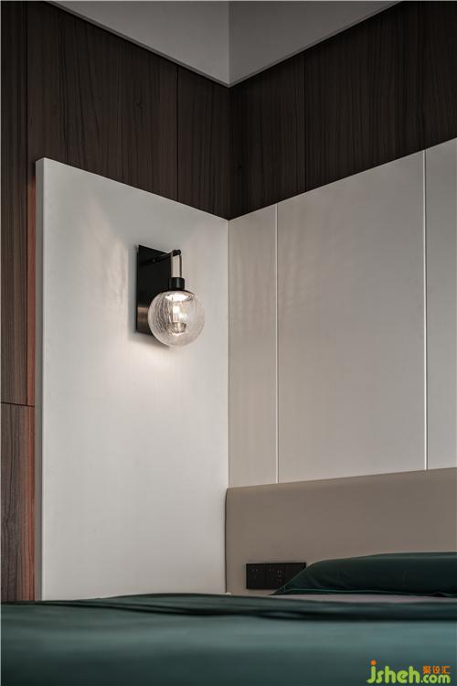 次臥的墻面采用了木飾面,床頭背景墻做了一個(gè)白色的硬包造型,讓空間色調(diào)與兒童房相統(tǒng)一搭配床頭軟包,使得空間更有層次感。兩邊的燈-邊采用了壁燈的形式,另一邊采用了吊燈的形式,在空間里也顯得更加有設(shè)計(jì)感。