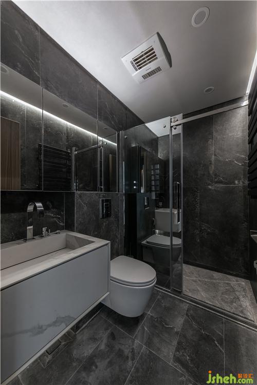 衛(wèi)生間做了干濕分離,采用的是鏡柜,集收納、實(shí)用、美觀于一體,臺(tái)盆深一些防止濺水,浴室柜材質(zhì)為大理石紋路的白色巖板。墻面、地面為.三分之一工字鋪的黑色地磚。