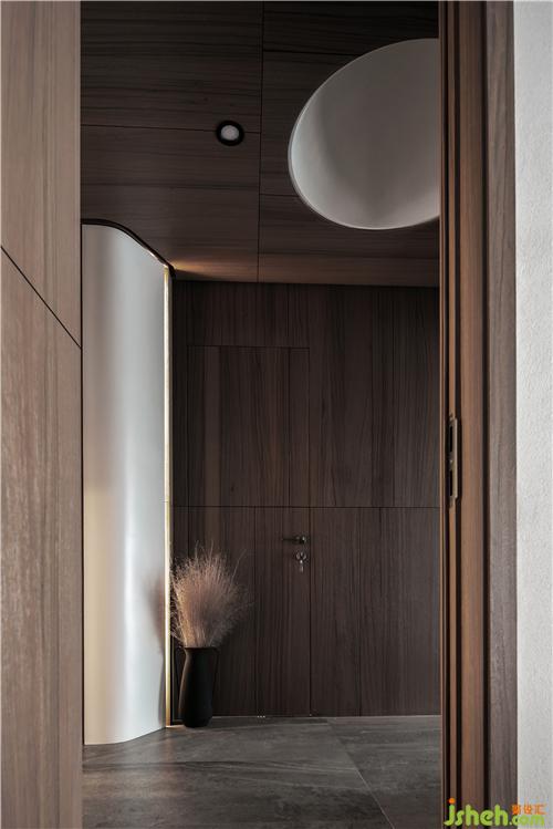 隱形門(mén)設(shè)計(jì)將門(mén)融入了背景里,搭配灰色仿巖板地磚,整體色調(diào)相統(tǒng)一。
