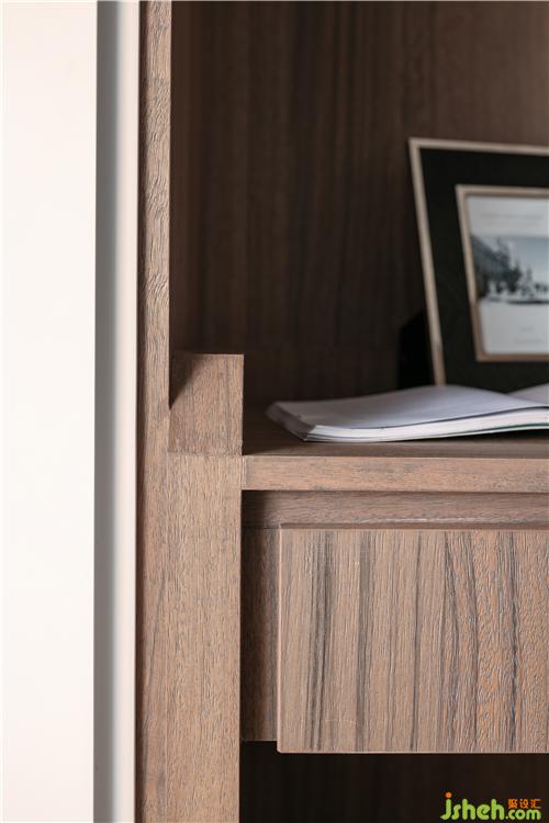次臥的床的對(duì)面為一整排衣柜,柜體為木色,柜門(mén)為白色烤漆柜門(mén),無(wú)拉手設(shè)計(jì)。中間部分為梳妝臺(tái),也可以作為書(shū)桌使用。衣柜與梳妝臺(tái)為一體。吊柜柜門(mén)做木格柵造型,下面暗藏?zé)魩А?