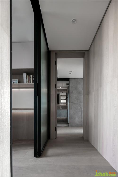 書房的長虹玻璃門是吊軌式的,這種工藝需要在前期天花設(shè)計時預(yù)留軌道槽,地面不用安裝軌道,解決了傳統(tǒng)推拉門軌道清潔的痛點。