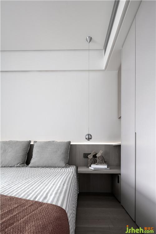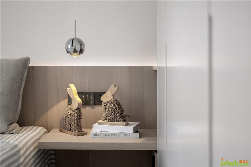 床頭處延伸到地柜室內(nèi)設(shè)計師也做了一體處理,減少了成品柜體的衛(wèi)生死角,也讓整個空間的效果呈現(xiàn)更加整潔。