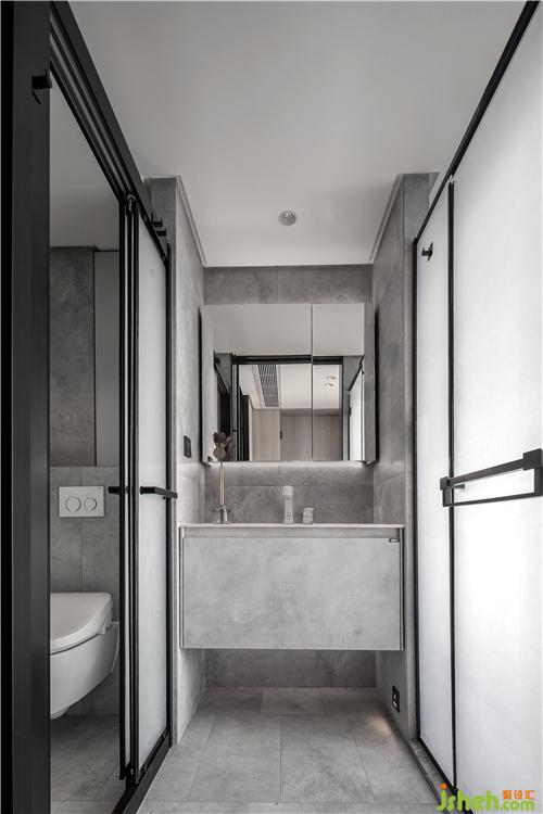 淋浴間用玻璃隔斷借用主臥光源,彌補(bǔ)了采光不足,三分離衛(wèi)生間是利用率最高的方式,同時滿足兩個人使用,室內(nèi)設(shè)計師在墻磚與天花交接的區(qū)域留20mm的工藝縫,如果直接相碰,收口會很粗糙。實際上任何兩種材料在一起搭配的時候,都要留有距離或者退位,這是中華工匠代代相傳的智慧。