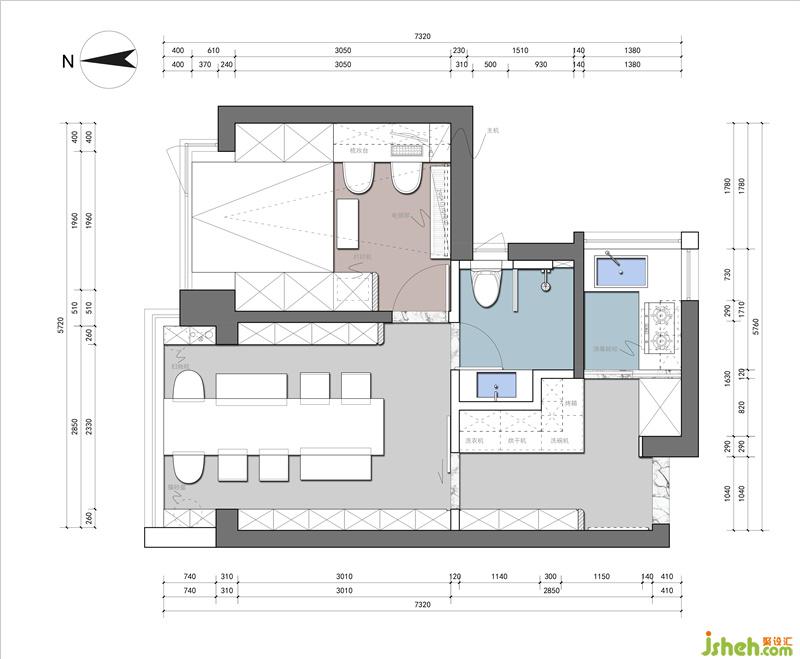 入戶有個(gè)全身鏡,替代了傳統(tǒng)衣柜里的鏡子,拖鞋位在鞋柜底部,中廚延伸出來(lái)是西廚的臺(tái)面,地柜是電器柜,放置洗衣機(jī)、烘干機(jī),烤箱。大部分小戶型沒(méi)有晾衣服的條件,烘干機(jī)也被越來(lái)越多年輕人接受。