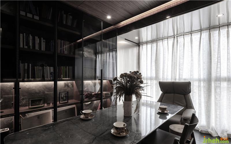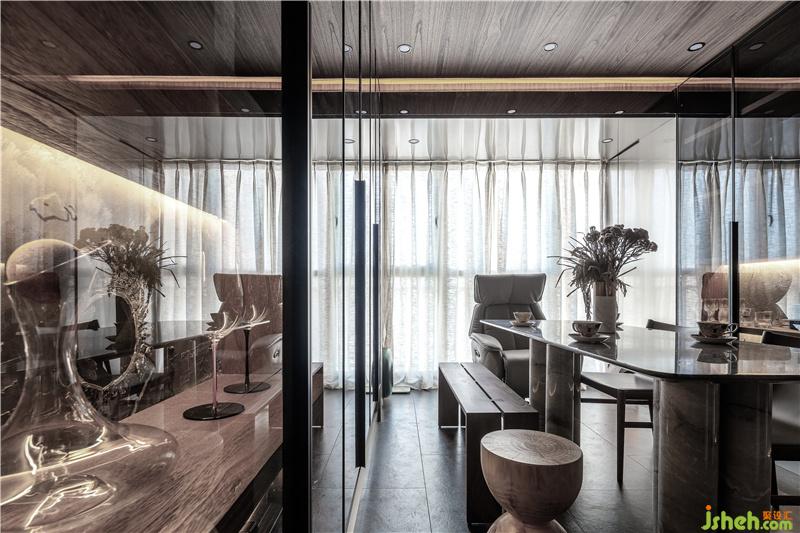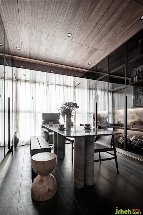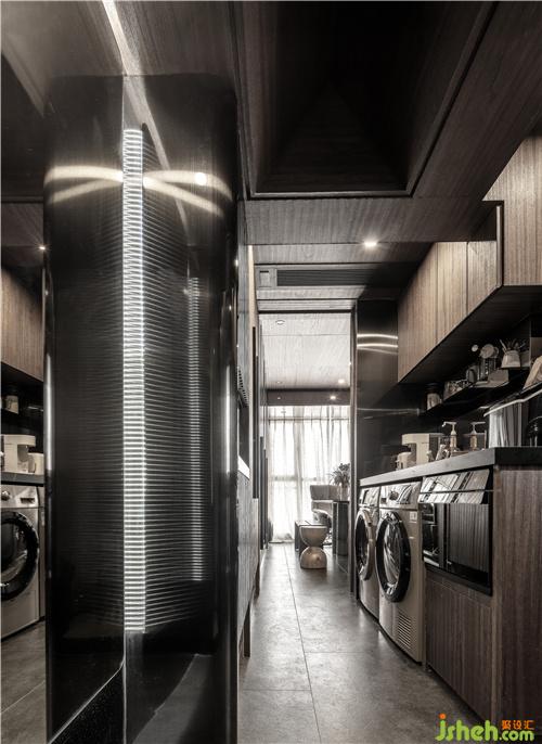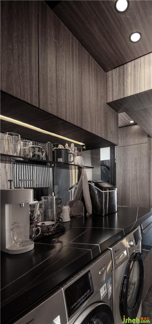 在這個(gè)空間里,室內(nèi)設(shè)計(jì)師柜門用了黑玻,既可以有視覺(jué)的延伸,方便拿取里面的物品,黑玻把物品的飽和度過(guò)濾掉,不會(huì)顯得雜亂,天花和墻面材質(zhì)是統(tǒng)一的木飾面,不分割空間,更加整體。
