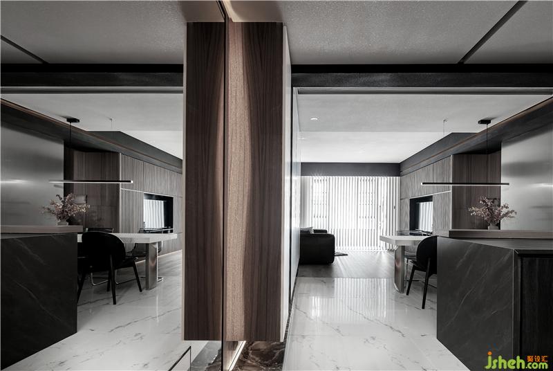 入戶即玄關(guān),緊靠原戶型的左邊的承重墻前設(shè)計(jì)了玄關(guān)柜,玄關(guān)墻面以木飾面進(jìn)行裝飾,正對(duì)入戶門(mén)的柜子,做了懸空的設(shè)計(jì),下方是大理石地臺(tái),入戶形成一定的遮擋,又滿足了儲(chǔ)物的需求??繅Φ脑O(shè)計(jì)了一面大大的鏡子, 鏡子四周藏著燈帶,來(lái)清晰地顯現(xiàn)空間輪廓,營(yíng)造出明暗層次、虛實(shí)對(duì)比的視覺(jué)感。