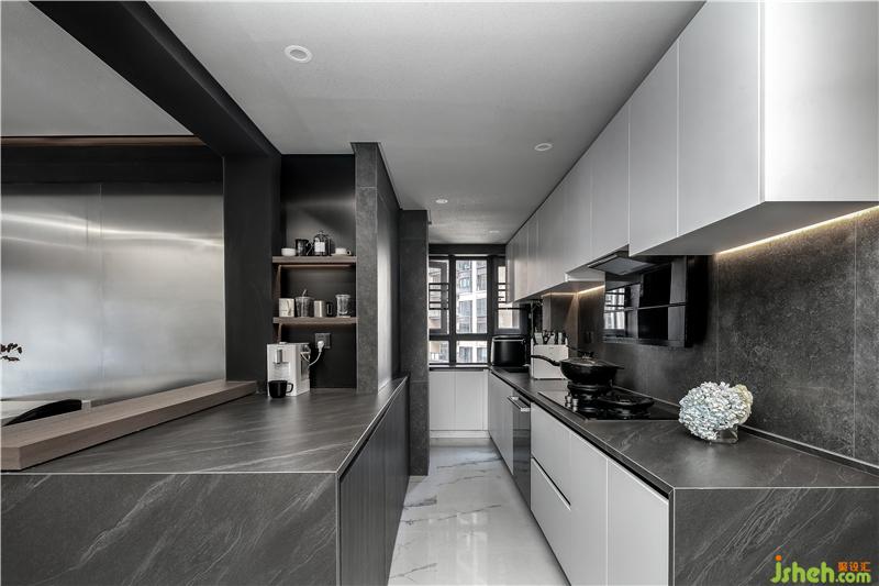 廚房地面為白色大理石,背景使用了灰色調(diào)的瓷磚,與白色櫥柜的搭配,使得風(fēng)格更簡(jiǎn)約、高級(jí)。與黑色臺(tái)面搭配十分凸顯質(zhì)感。在吧臺(tái)區(qū)依靠承重墻與煙道的關(guān)系,設(shè)計(jì)了面層架,吧臺(tái)區(qū)與廚房相接,減少了墻面的阻擋,形成更加開(kāi)放的空間感,黑色臺(tái)面的吧臺(tái)與墻面相連接, 開(kāi)放式廚房的設(shè)計(jì),貫穿東西,連接房間的同時(shí),讓空間的整體視野更加開(kāi)闊,并形成良好的室內(nèi)對(duì)流。