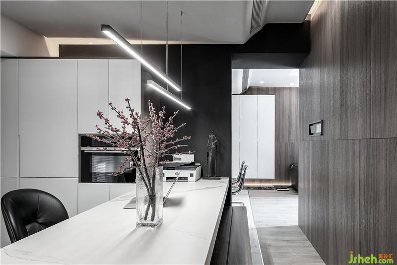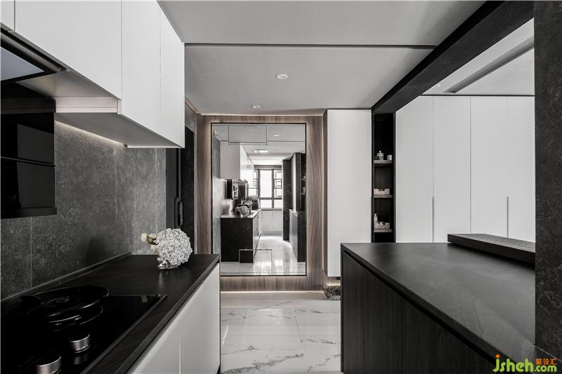 入戶右邊為原先的封閉式廚房,設(shè)計(jì)師將廚房設(shè)計(jì)為開(kāi)放式廚房,在廚房是簡(jiǎn)約大氣的黑白系,帶來(lái)更強(qiáng)大的明亮感和開(kāi)闊感。臺(tái)面為黑色的大理石,櫥柜為啞光白色烤漆柜門(mén),一黑一白,對(duì)比呼應(yīng)。在玄關(guān)與廚房的天花間設(shè)計(jì)了一段軌道,用以區(qū)分兩個(gè)空間。