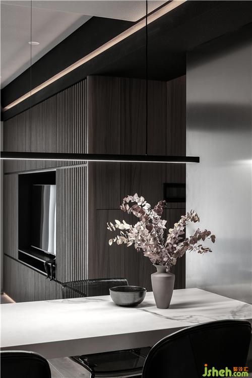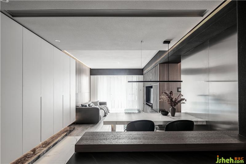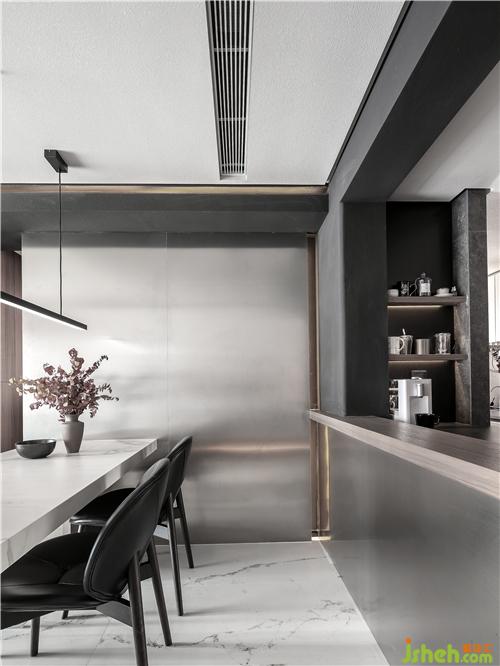 相鄰的開(kāi)放式輕吧區(qū),以不銹鋼確立分界,輔以木色的臺(tái)面。餐廳的墻面整面是不銹鋼,在與吧臺(tái)區(qū)的墻面處藏有燈帶。餐桌是白色大理石,桌腿是不銹鋼造型,這兩旁是一對(duì)皮子靠椅和一對(duì)灰色透明亞克力的椅子。