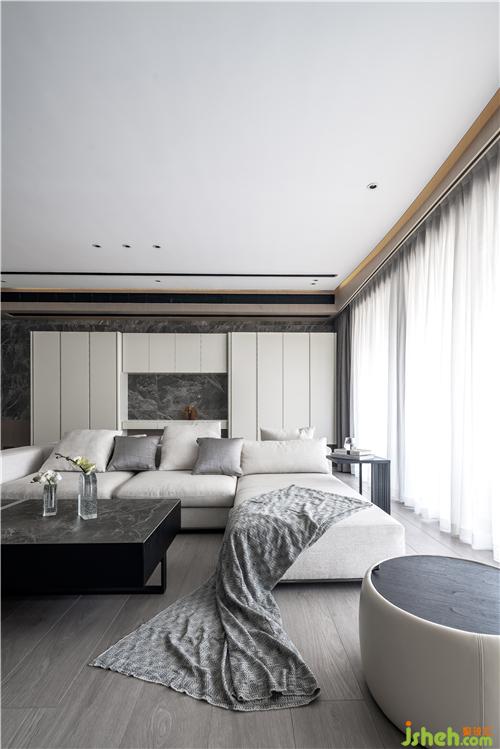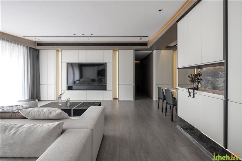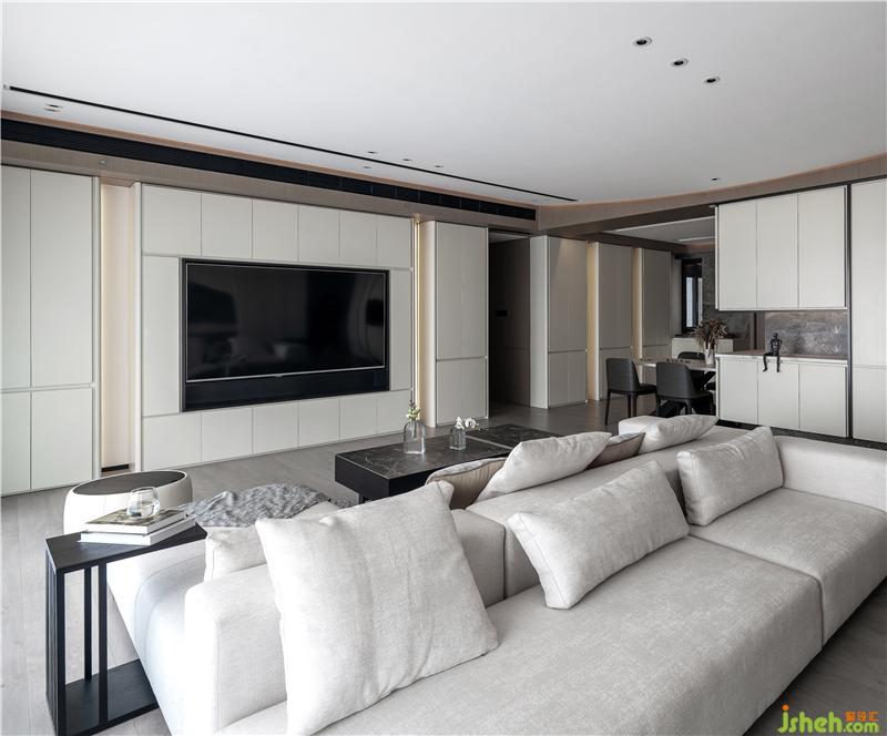 客廳主色調(diào)是白灰色,電視墻的設(shè)計(jì)內(nèi)凹了兩條光,削減了體量,使風(fēng)口與背景墻的結(jié)構(gòu)更平衡,空間的留白是至關(guān)重要的,未來可以有更多的可能性。