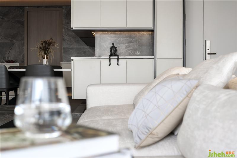 大面積用了米白色烤漆柜門,空間干凈利落,造型上遵循了減法原理,增加了公區(qū)的收納性,電視柜和酒柜的材質(zhì)和顏色統(tǒng)一,在畫面上形成整體,雙面沙發(fā)的設(shè)計(jì)增加了各個(gè)空間的互動和對話。