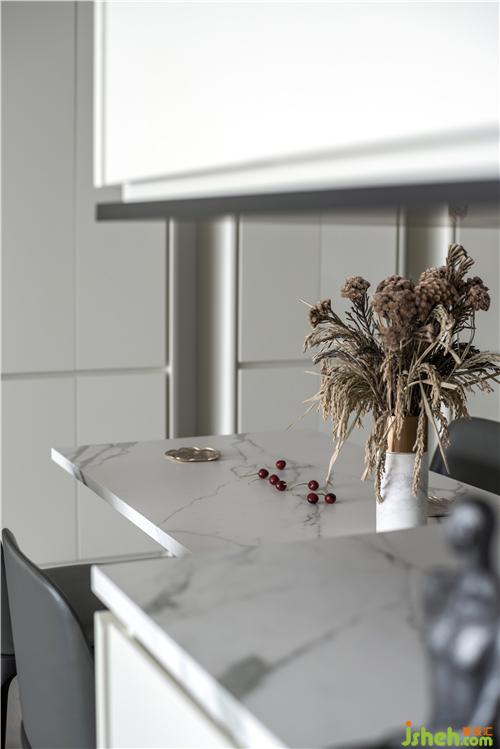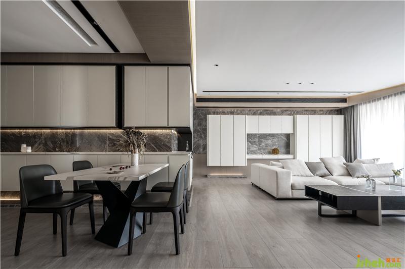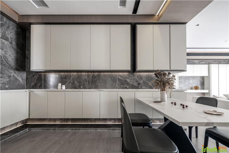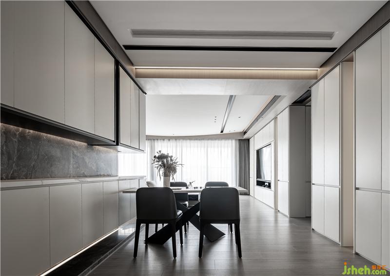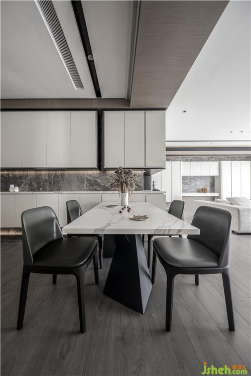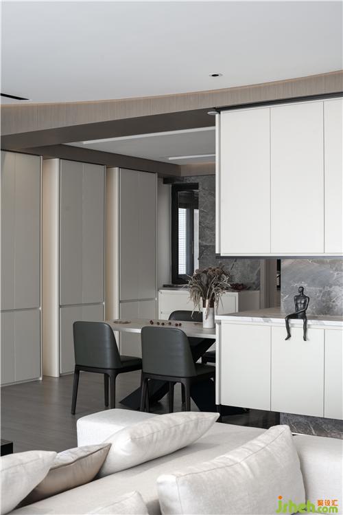 餐廳以白和灰色配合,勾勒出朦朧的清透感,又選擇色彩較厚重感的餐桌椅,使整體空間輕盈而又不失穩(wěn)重,深圳裝修設(shè)計(jì)油然生起一種家的歸屬感。餐邊柜簡潔明朗、干凈利落,以功能為設(shè)計(jì)目的和中心,最大程度釋放空間能量。