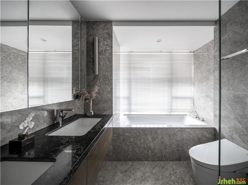 衛(wèi)浴空間延續(xù)了整體空間的黑白灰色調(diào),防水石膏板的吊頂讓空間看上去更加地有質(zhì)感,現(xiàn)場制作的浴缸,在空間色系上形成統(tǒng)一。