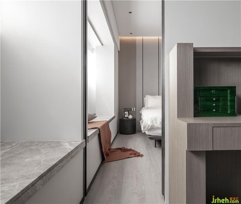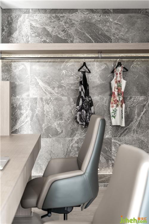 衣帽間在主臥內(nèi),利用書桌結(jié)構(gòu)設(shè)置了隱形門,形成環(huán)形動(dòng)線,隱形門關(guān)起來畫面是整體性的,打開之后可以互相對(duì)話。