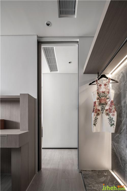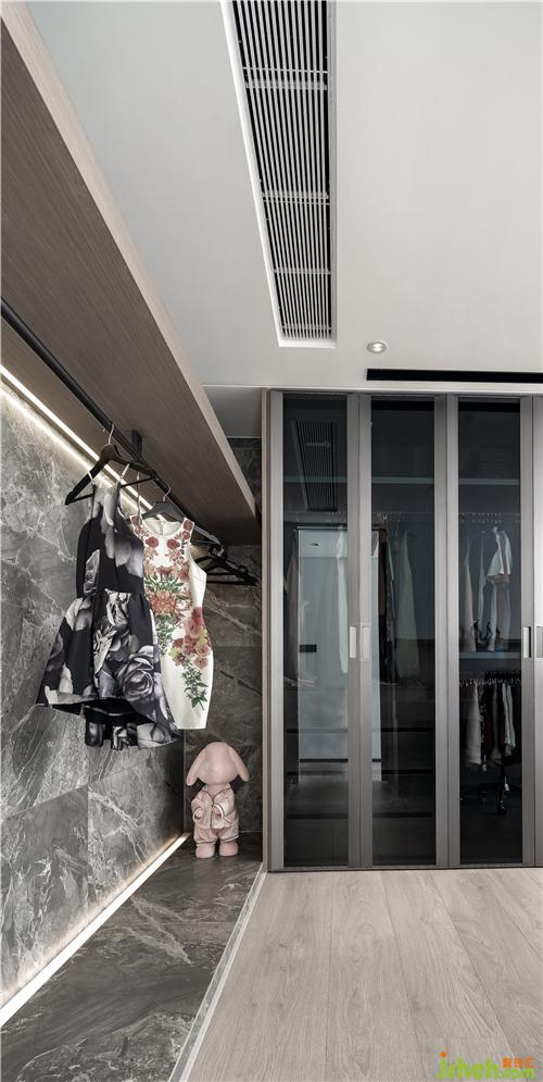 衣帽間采用開放格與封閉柜門結(jié)合的方式,滿足客戶對(duì)于不同衣物的收納,加入線性燈更加便于衣物的拿放。