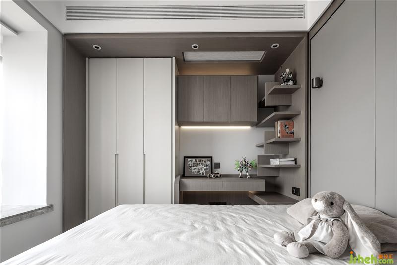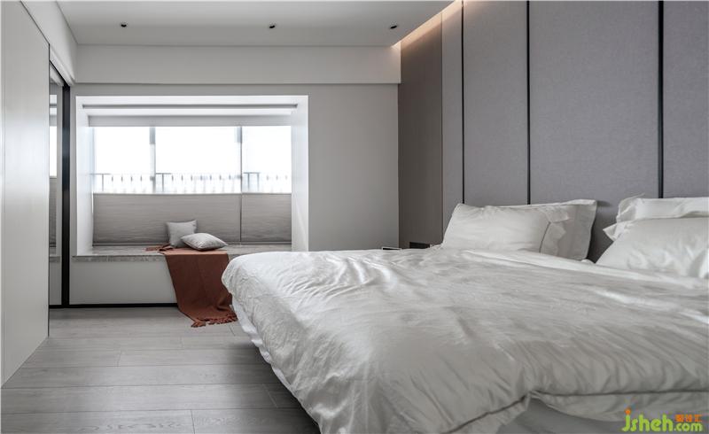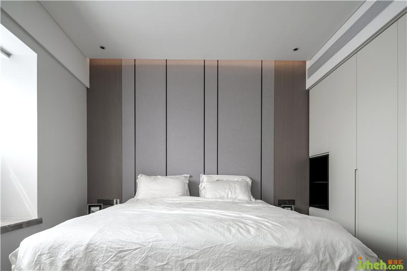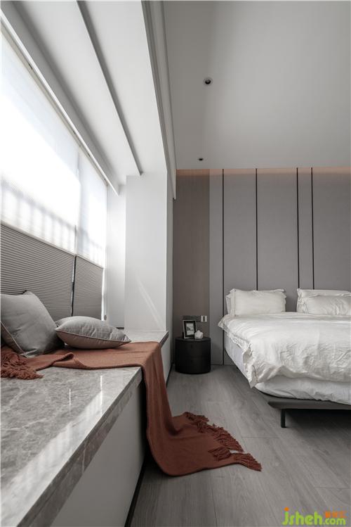 灰藍(lán)色的床頭背景搭配干凈明朗的床品,極簡的落地?zé)敉ㄟ^墻體反射光照明,光線更柔和,深圳裝修設(shè)計(jì)營造一個(gè)溫馨的睡眠空間。