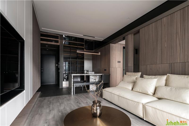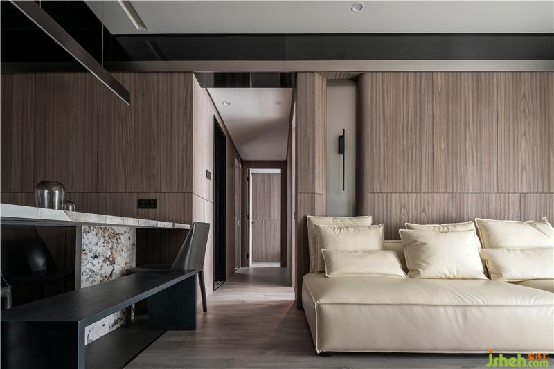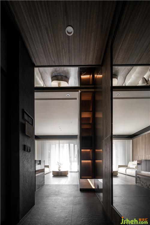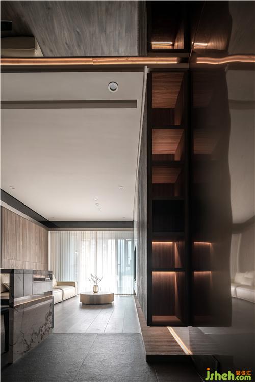 入戶即玄關(guān),緊靠原戶型的左邊的承重墻前設(shè)計了入戶全身鏡,然后頂天立地的玄關(guān)柜,深圳中空和下方地臺滿足進門隨手放鑰匙和鞋子的習慣。做了燈光裝修設(shè)計避開了直視燈光,減少了燈光污染,頂天立地的木格珊柜門的鞋柜,隱藏柜門的設(shè)計讓柜子畫面干凈且不搶視線。