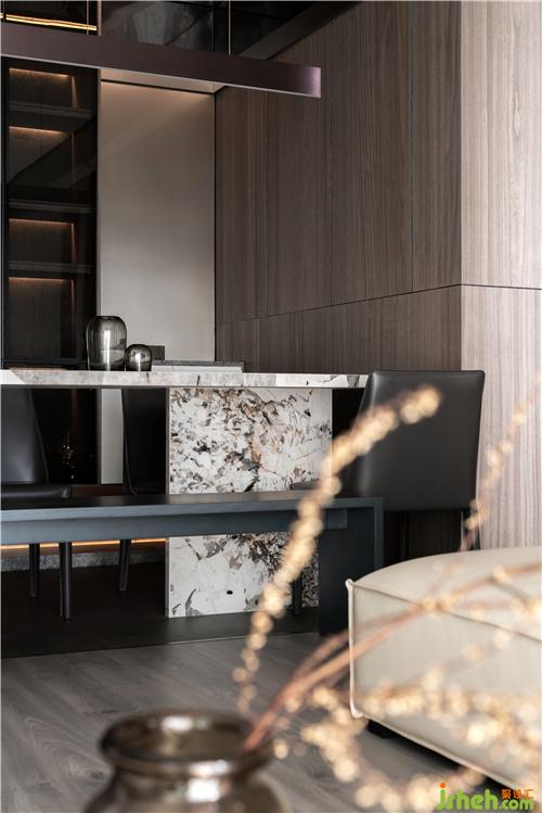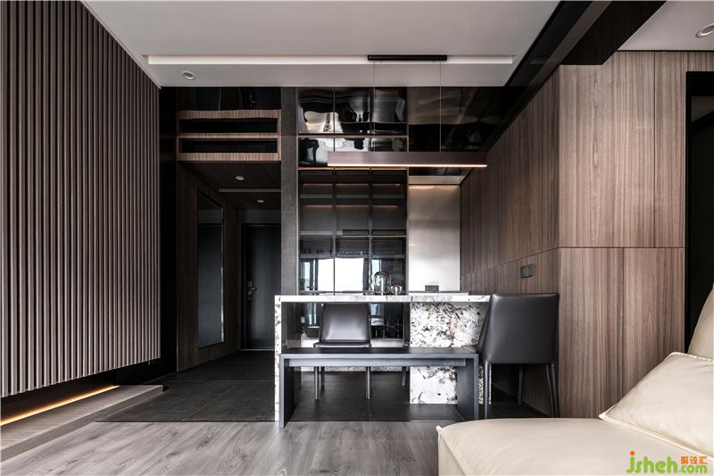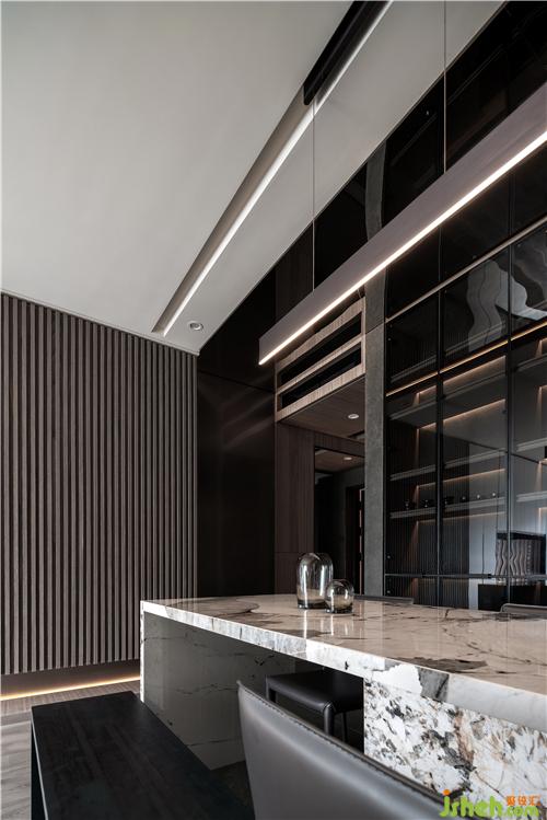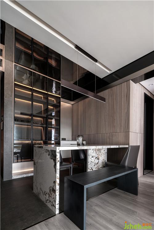 原本的廚房門這邊做了鏤空的展示柜和開放操作臺,開放的操作臺下面可以放一些雜物提供給餐桌使用,業(yè)主在生活中發(fā)現(xiàn)的美麗擺件和收藏的酒和茶,可以展示在透明的玻璃柜里,看到心情也是極好的。