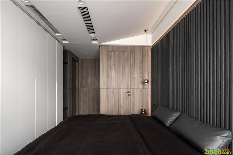 進(jìn)入主臥房,天花做了斜頂?shù)脑O(shè)計,讓空間的線條多元化的同時增加了一些未來感。