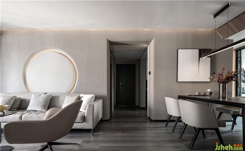 沙發(fā)背景和餐桌背景選擇了統(tǒng)一的淺色的涂料,不喧賓奪主的同時增加了空間協(xié)調(diào),同時沙發(fā)背景圓形造型和餐桌正方形簡約掛畫,一圓展示家庭溫馨的感受,一方給予人克制感,讓業(yè)主居住空間張弛有度。
