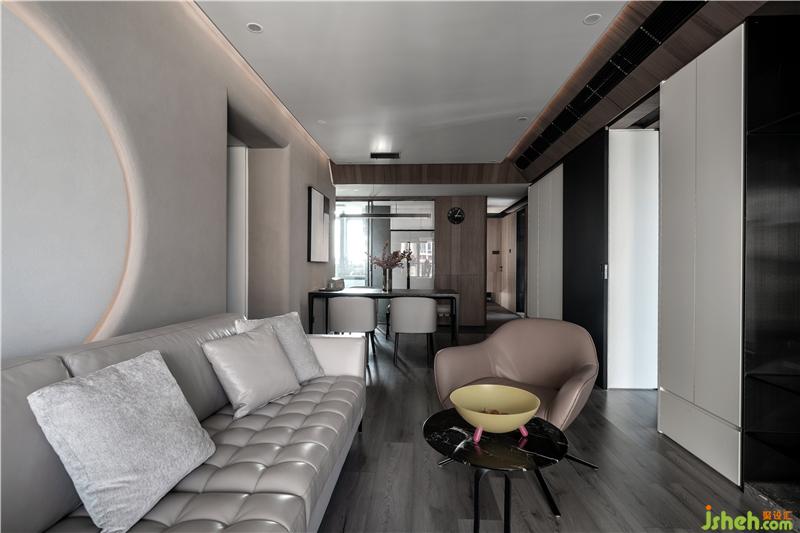 利用過道動線,把客廳一分為二,一邊會客空間,另一邊是餐廳空間。讓整個空間區(qū)分開來,卻做好空間區(qū)分,也讓整個客廳空間放大的效果。