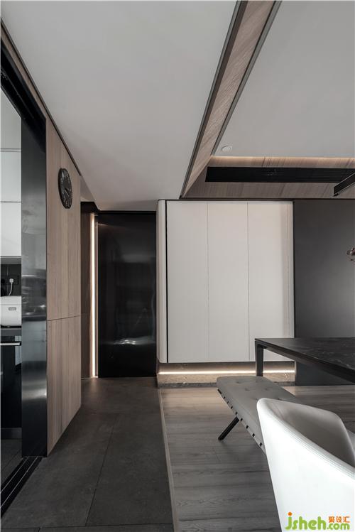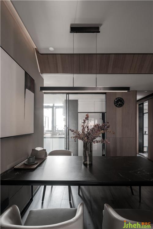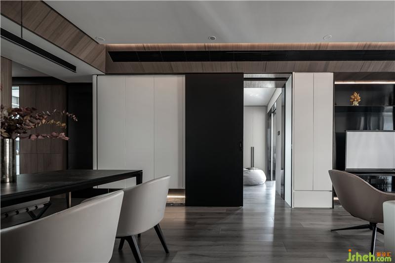 客餐廳通向主臥,推拉門可以隔絕業(yè)主在家也能辦公的自由。
