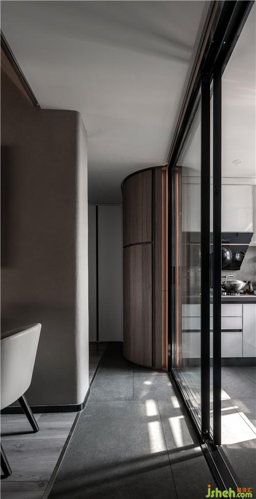 業(yè)主的父母會在靠近餐廳旁的中廚,進行一日三餐的制作,中廚過道的動線直接連接玄關(guān)鞋柜,此間轉(zhuǎn)角的設(shè)計成圓弧形,讓孩子在家庭穿梭的空間多一些保護性,增加了空間柔軟包容感。讓我們的設(shè)計理念得以釋放,設(shè)計源于生活,也融入生活。