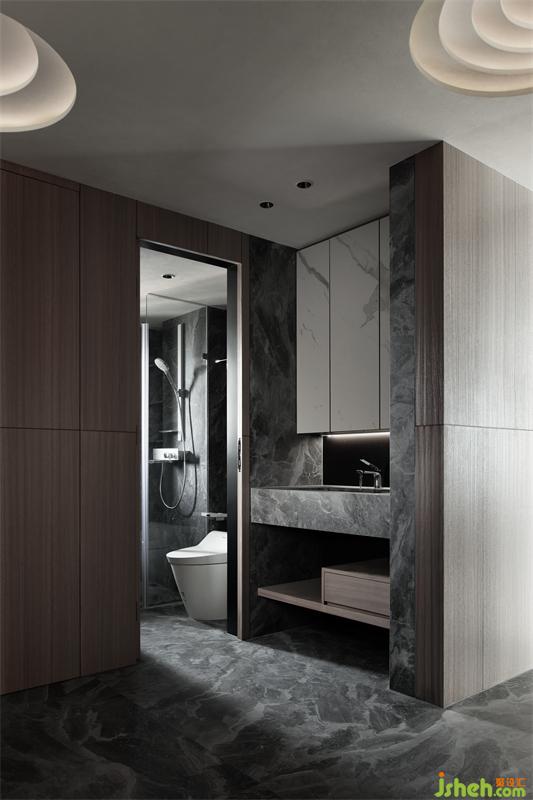 衛(wèi)生間大面積運(yùn)用大理石搭配黑鋼的設(shè)計(jì),在整理保持美感的同時(shí)降低維護(hù)陳列感,利用光影鏡面放大空間格局,視覺感開闊自由。
