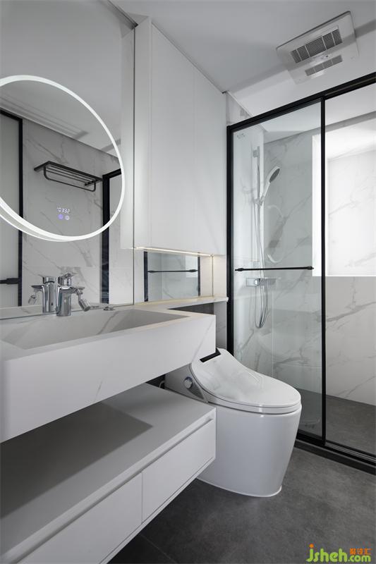 衛(wèi)生間采用白色的潔具搭配白色自然大理石質(zhì)感的墻磚,統(tǒng)一的色調(diào),在視覺上有擴(kuò)大空間效果的作用,整體有一種干凈整潔的感覺。