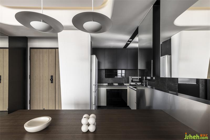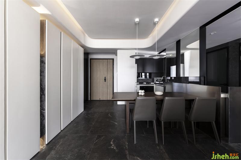踏入餐廳,鏡子引光入室營造氛圍感,整體效果呈現(xiàn)一個深色炫酷的空間,展示了一系列令人驚訝的紋理和創(chuàng)意。